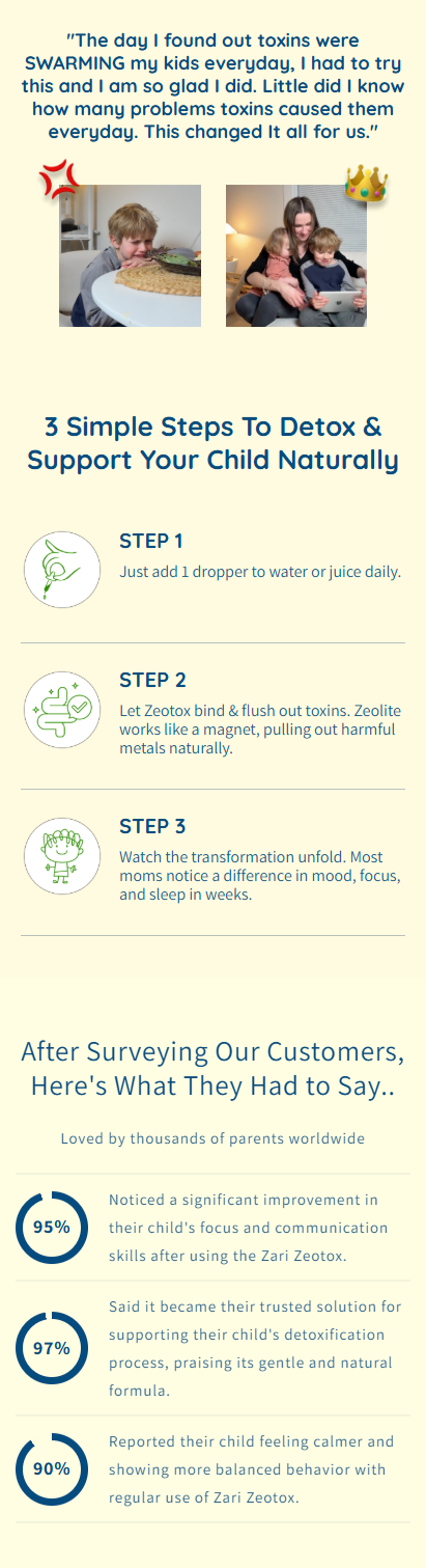 The Zari Zeolite Detox Drops use natural zeolite, a powerful mineral that binds to toxins like heavy metals (Aluminum, Lead, Mercury) in the body. These drops support your child’s natural detoxification process, helping to improve focus, balance behavior, and boost overall well-being. Simple, safe, and easy to use, the drops can be added to water or juice, making detoxing effortless and stress-free for children.